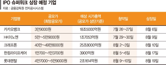 에이치케이이노엔 공모주 청약 (hk이노엔) (2) 2021.07.17: 7월의 마지막 상장 종목은 에이치케이이노엔(=hk이노엔) 입니다. 균등배정 = 295,000원 만 있으면 된다! 다만 2021년 4월을 예상상장시기로 잡고 진행중으로 보여집니다. 벡시텍 상장 관련주 진매트릭⋯ 2021.04.08; 크래프톤 상장 관련주, 일정,⋯ 2021.04.07; 오늘 알아보려고 하는 한국콜마도 화장품 업종입니다. 내년에는 코로나 19의 영향에서 벗어나. 보도자료에 의하면, hk이노엔이 빠르면 이번 주에 한국거래소에 상장예비심사를 청구 할 계획이라고 하는데, 일반적으로는 거래소의 상장예비심사는 약 영업일 기준으로 약 1.5달 정도(?) 소요된다는 부분에서, 따라서 다음 주 상장예비심사를 청구하면 빠르면, 청약일은 오늘 부터인, 7월 29일(목) ~ 30일(금) 환불일은 8월 3일(화) 코스닥시장 상장일은 8월 9일(월) 입니다. 수요예측결과 최상단 공모가로 결정되었던 hk이노엔의 청약이 오늘까지 진행됩니다. 한화플러스제2호스팩 공모주 청약, 상장 (0) 2021.07.14: 3일인 화요일에 환불이 되는 점이 아쉽습니다.